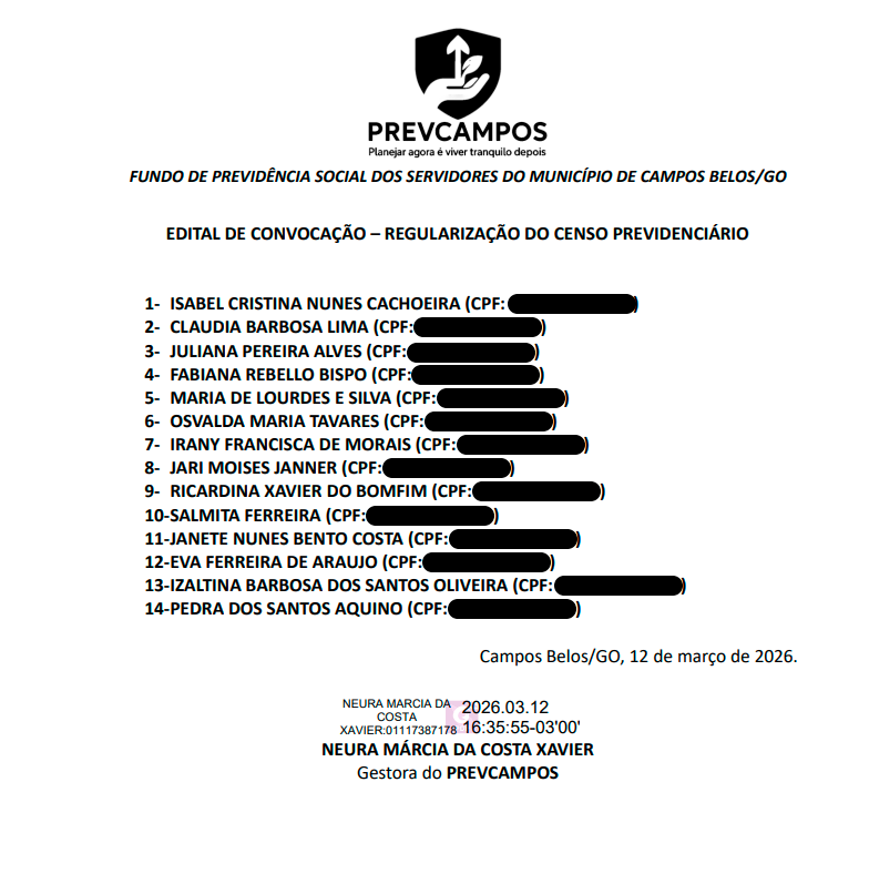 A gestora do PREVCAMPOS (Fundo de Previdência Social dos Servidores do Município de Campos Belos), Neura Márcia da Costa Xavier, publicou um Edital de Convocação para Regularização do Censo Previdenciário, destinado aos servidores que não compareceram dentro do prazo estabelecido para a atualização cadastral obrigatória.